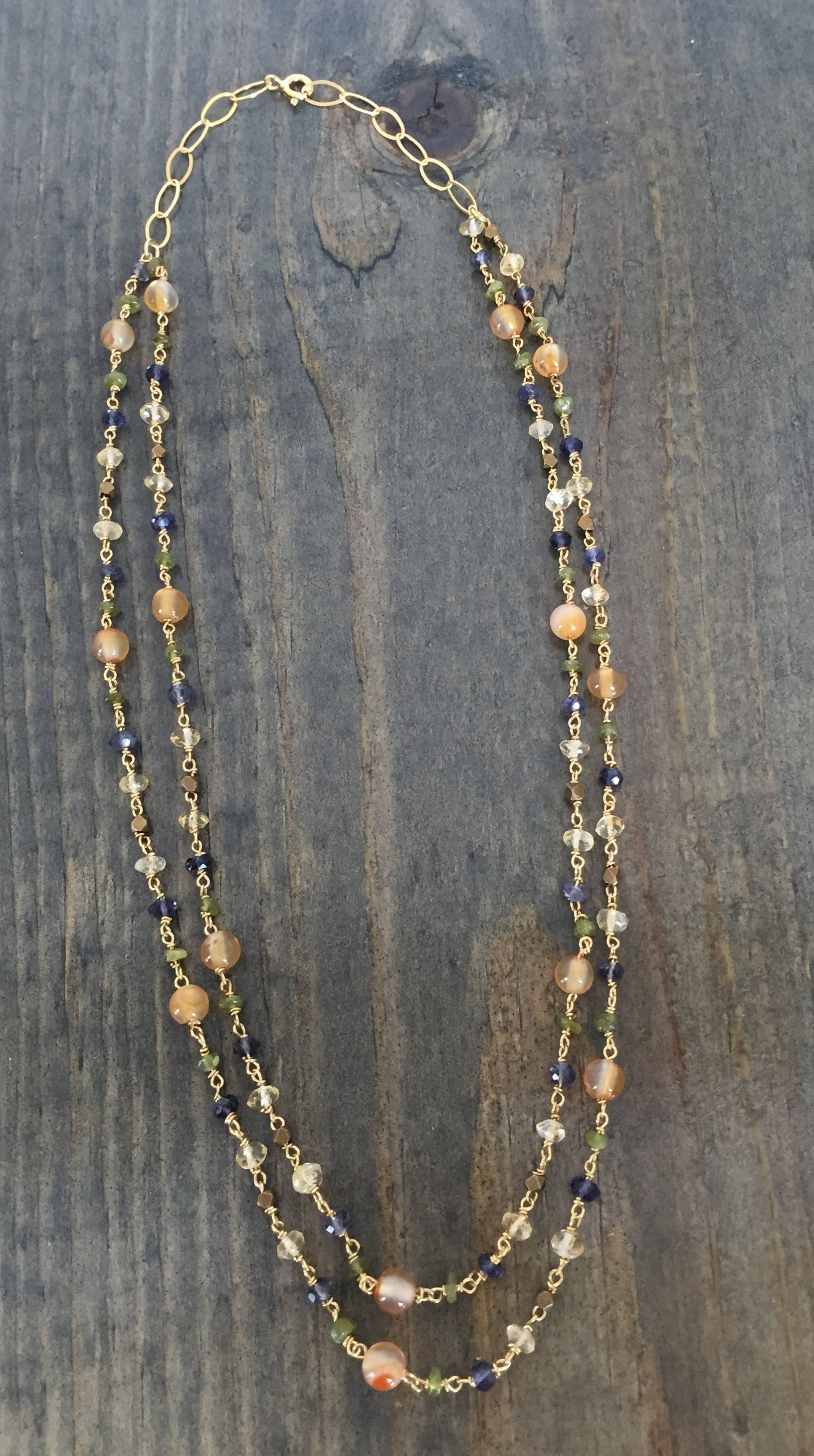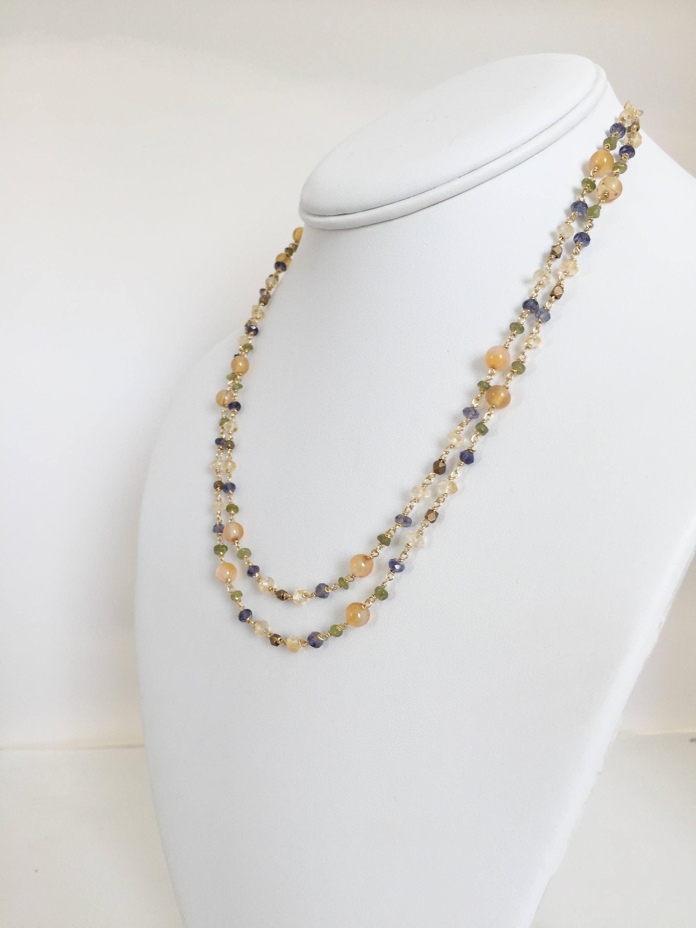 Add a pop of pretty color with this Mixed Gemstone Necklace. This Gold Gemstone Necklace of 14k gold filled, hand wire wrapped strands of Agate, Citrine, Idocrase, and Iolite beads make this one of a kind Layered Gemstone Necklace.