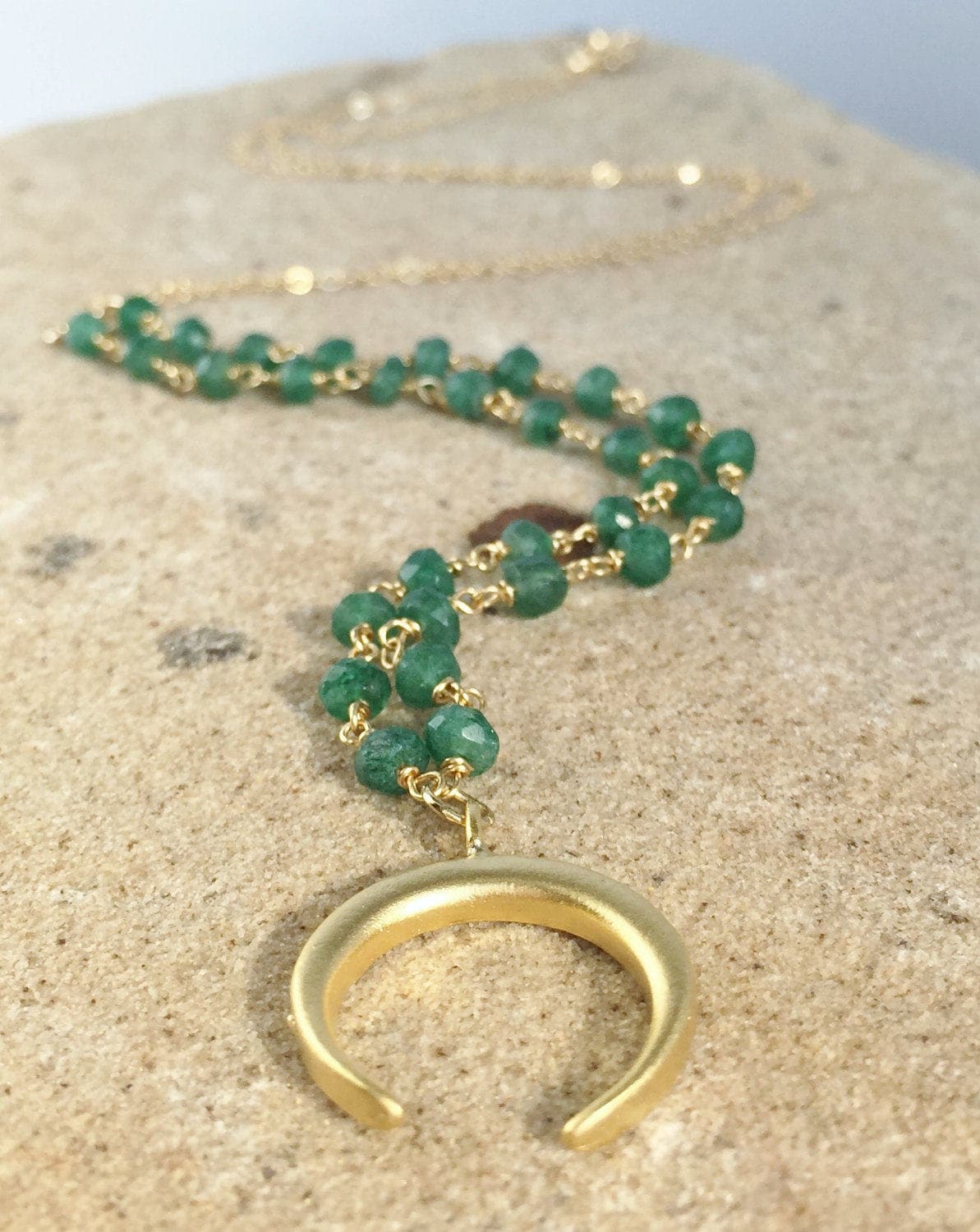 A gold crescent or half moon pendant is accented by Emerald Green gemstone beads wrapped by hand in 14k gold filled wire.