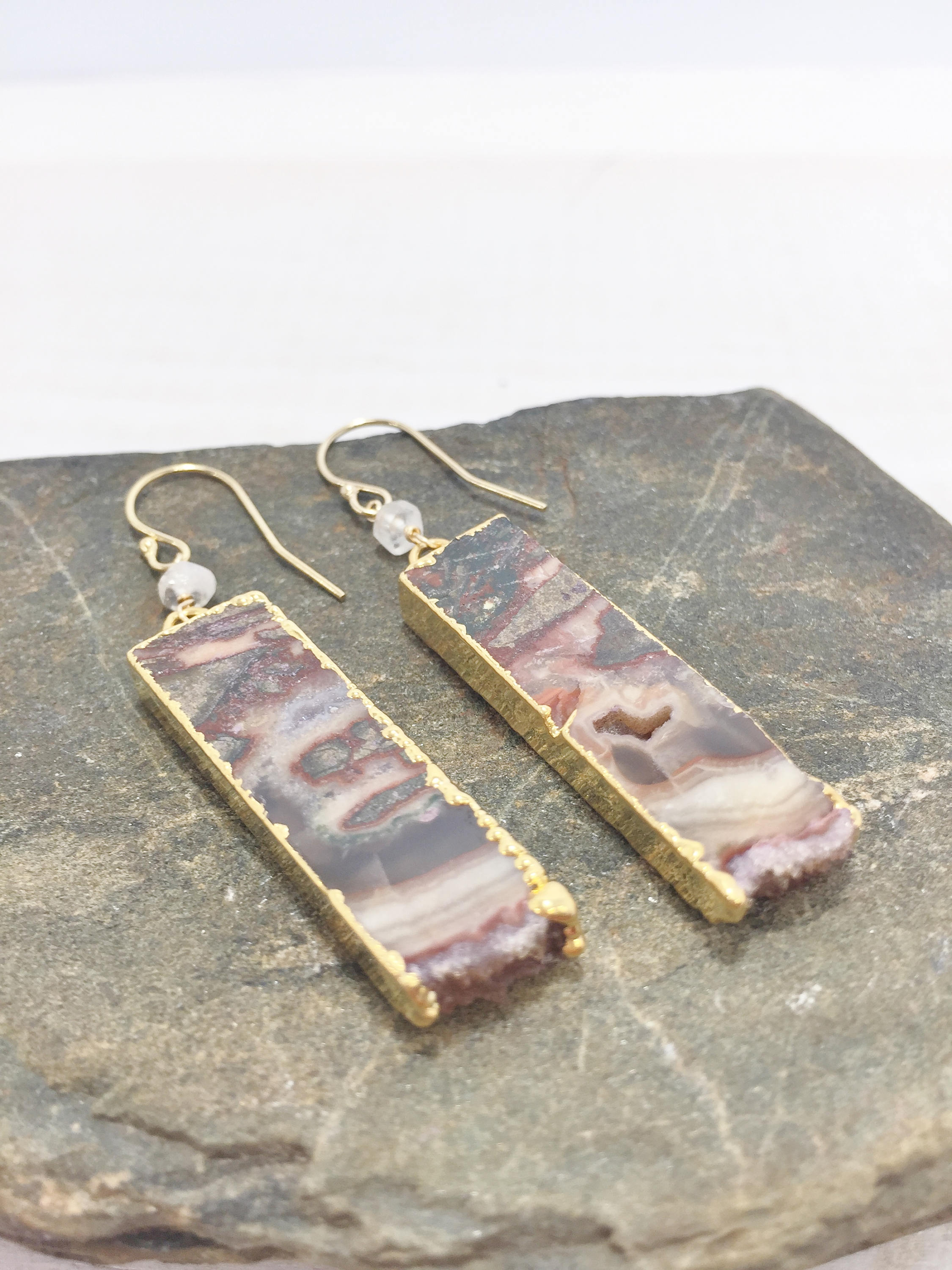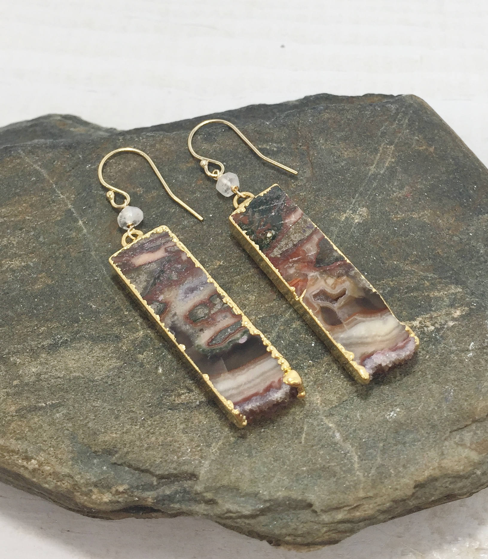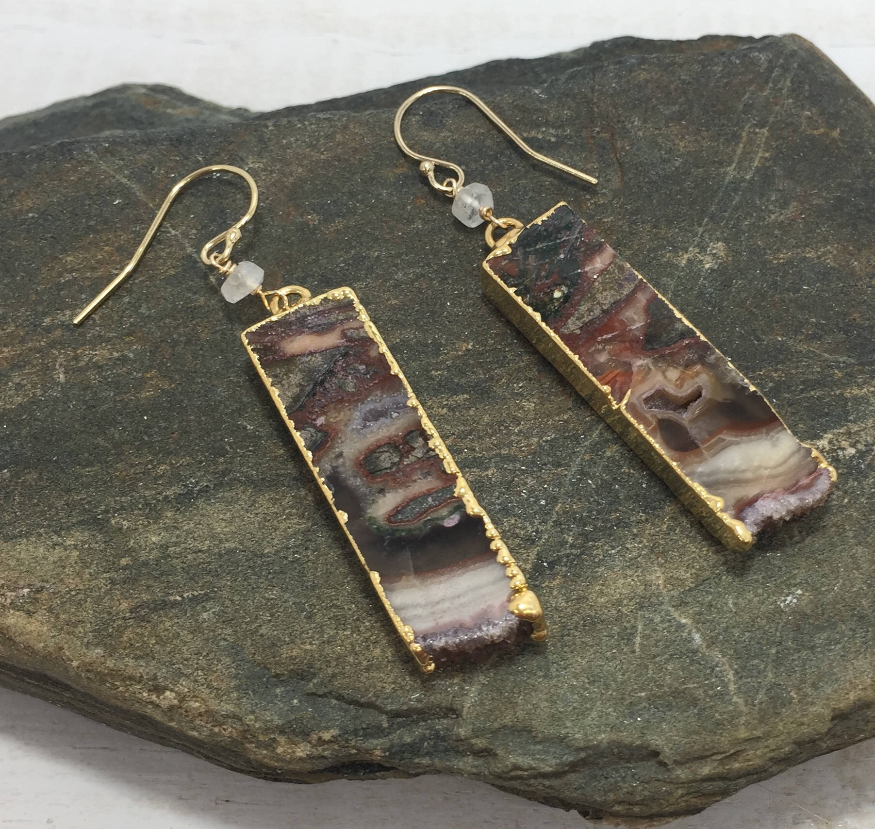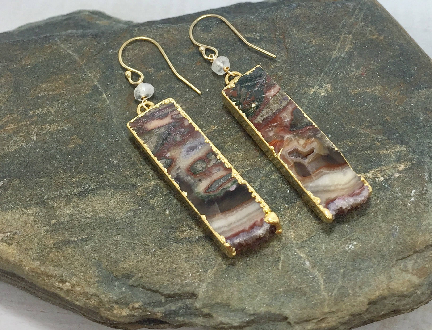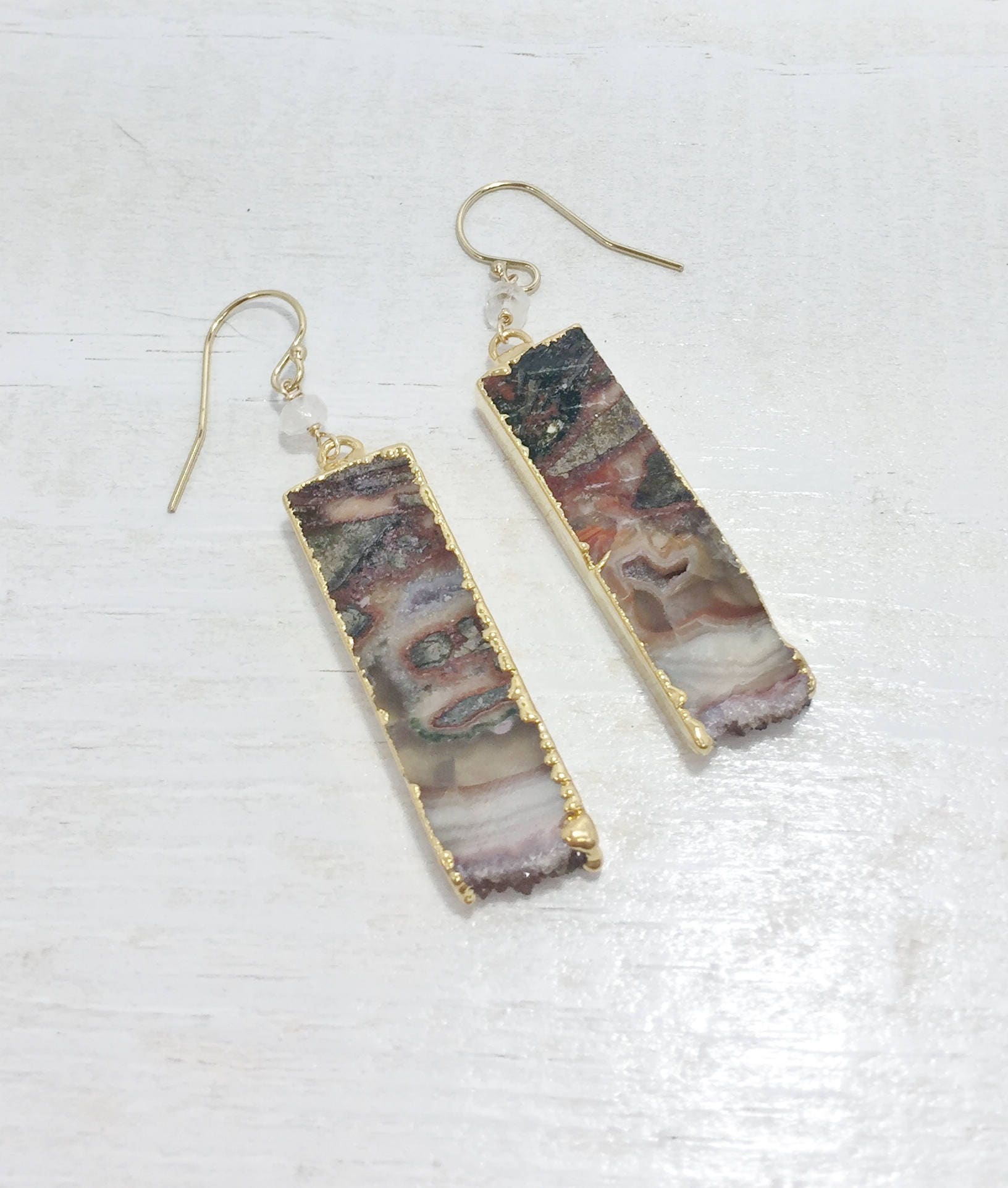 These Geode Slice Earrings feature Agate slices with natural swirls and patterns of white, black and brown, as well as edges of natural crystals also know as druzy. The Geode slices are edged in gold and dangle from gold filled ear wires. The Brown Druzy Dangle earrings also feature a wire wrapped moonstone accent bead. These one of a kind Boho earrings are the perfect addition to your gemstone jewelry collection, they would also make a great gift for her.