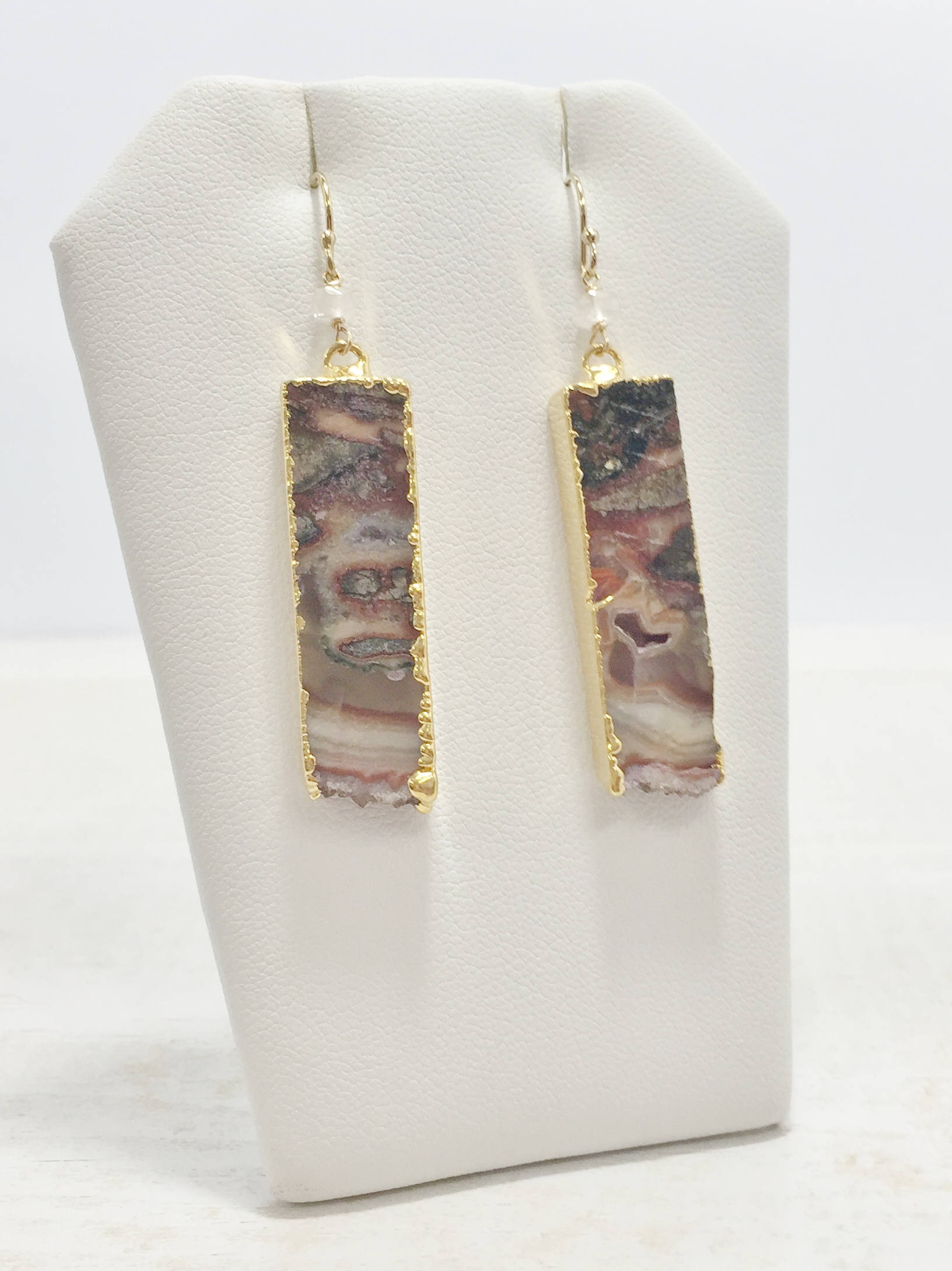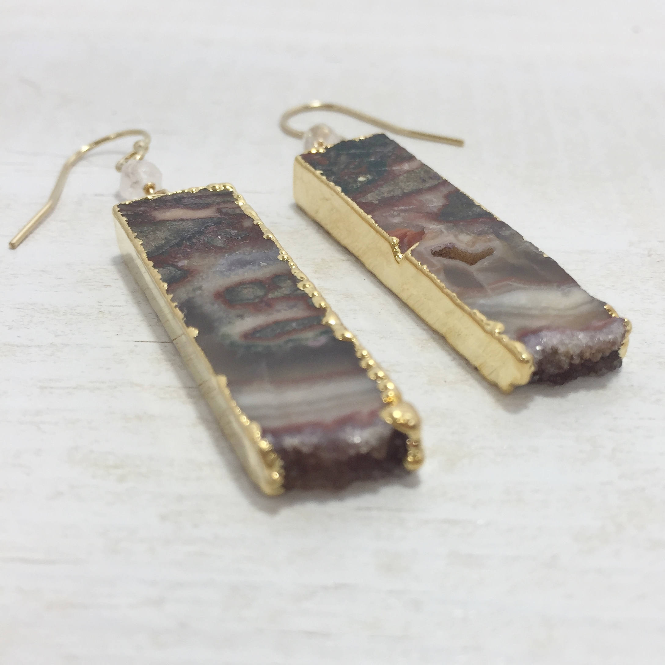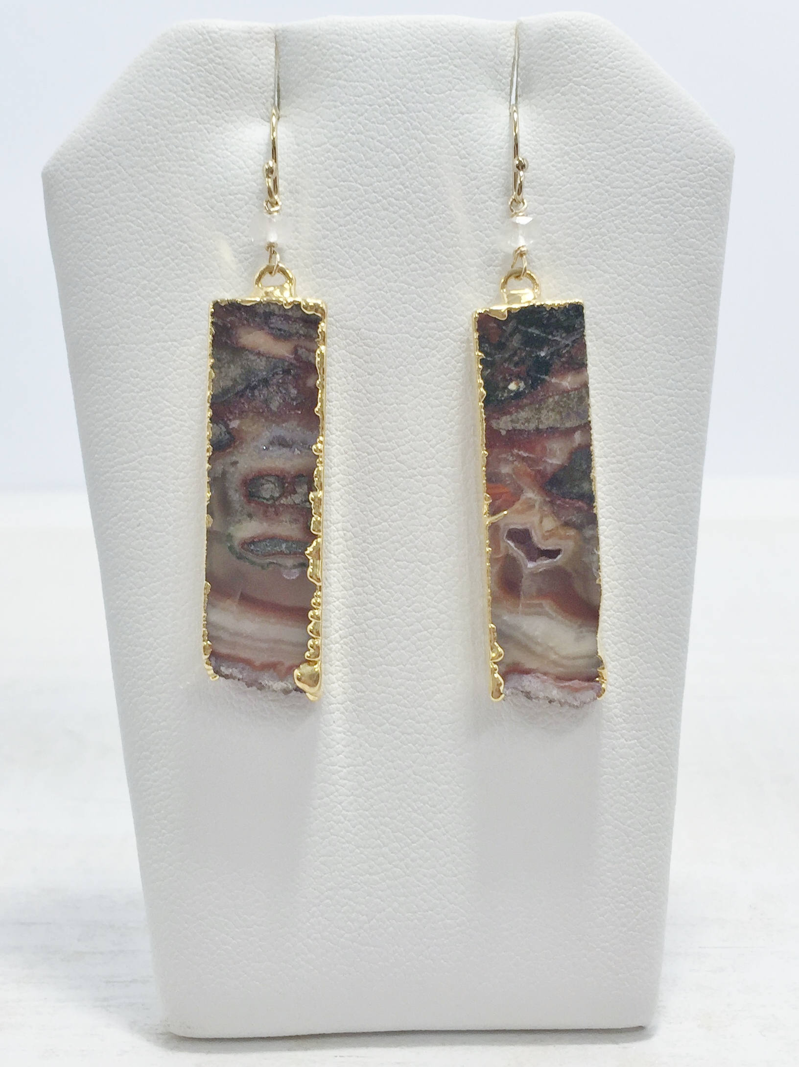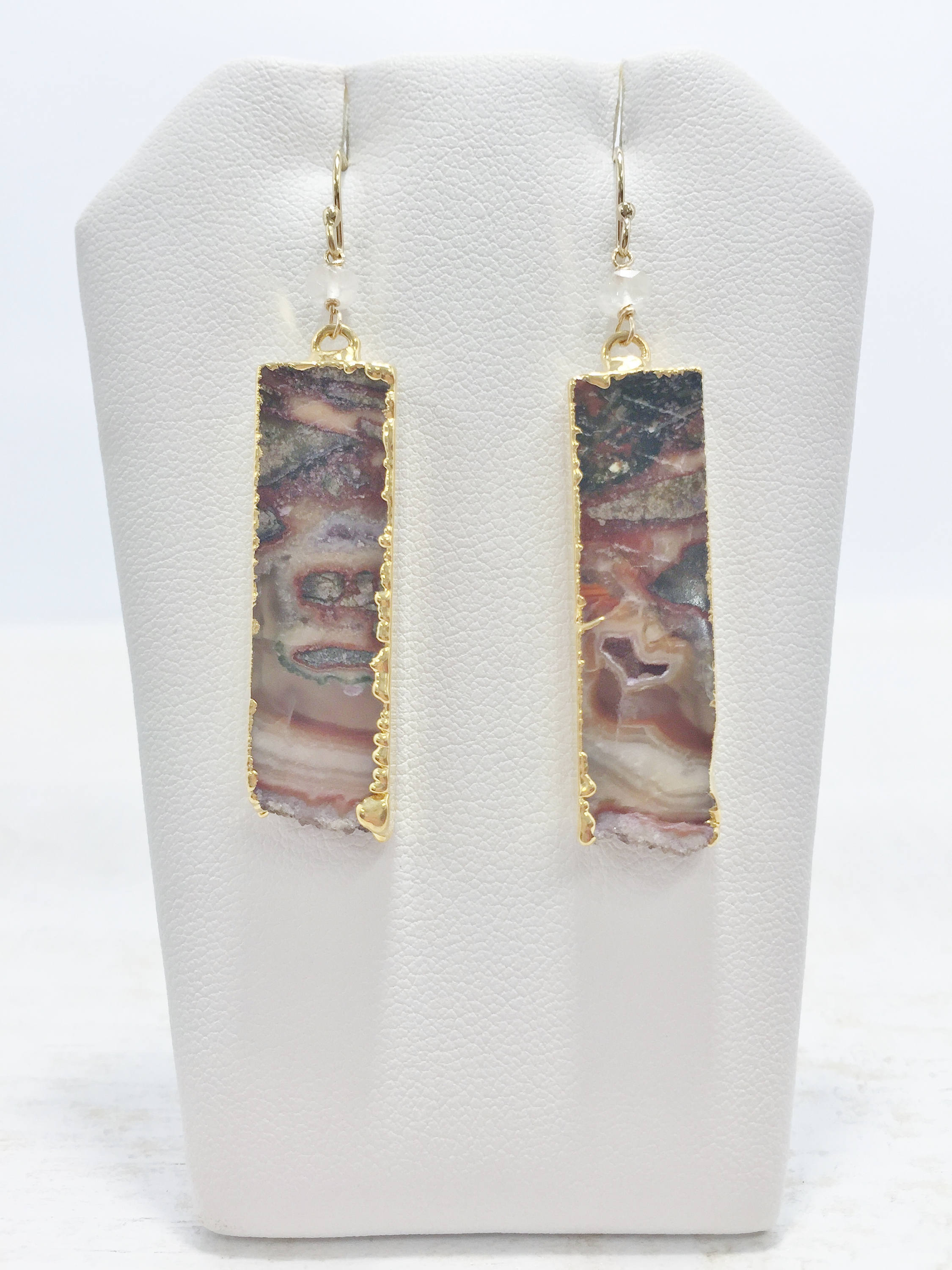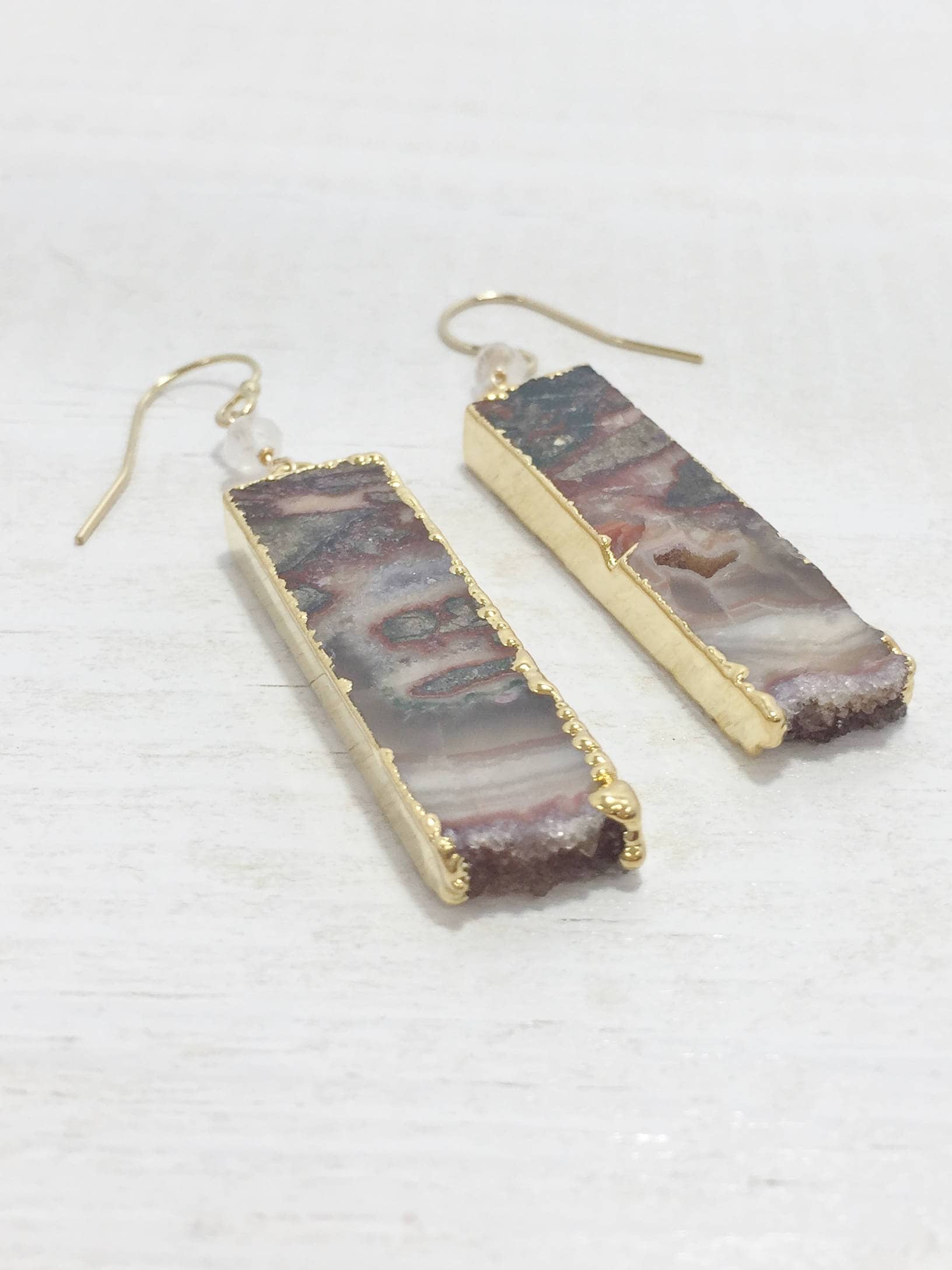 These Geode Slice Earrings feature Agate slices with natural swirls and patterns of white, black and brown, as well as edges of natural crystals also know as druzy. The Geode slices are edged in gold and dangle from gold filled ear wires. The Brown Druzy Dangle earrings also feature a wire wrapped moonstone accent bead. These one of a kind Boho earrings are the perfect addition to your gemstone jewelry collection, they would also make a great gift for her.